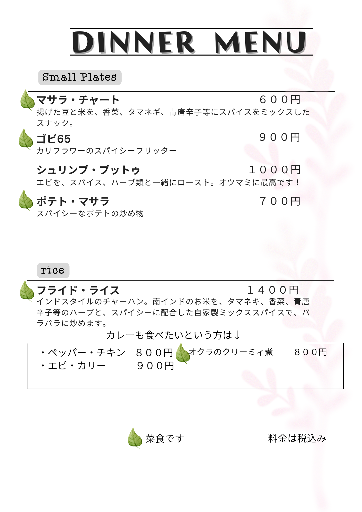 お酒のツマミ5品、まかない飯、あとはフリーRasam!